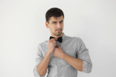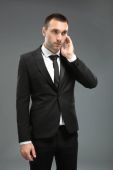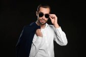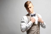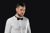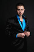 przystojny młody mężczyzna w kostiumie na ciemnym tle