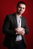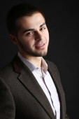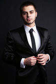 przystojny młody mężczyzna w kostiumie na ciemnym tle