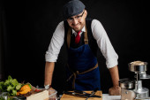 Środkowa część męskiego kucharza ostrzenia noża w kuchni handlowej