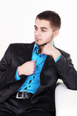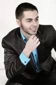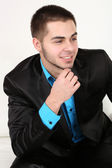 przystojny młody mężczyzna siedzi na kanapie, na jasnym tle