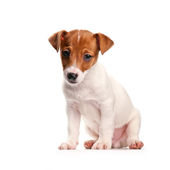 dziecko Jack Russell terier pies siedzi z jego ciała w jedną stronę i patrząc w drugą stronę na białym tle
