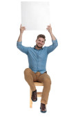 Szczęśliwy smart casual człowiek trzyma pusty billboard nad głową i uśmiecha się siedząc na krześle na białym tle studio