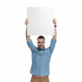 Zdjęcie "Szczęśliwy smart casual człowiek trzyma pusty billboard nad głową i uśmiecha się siedząc na krześle na białym tle studio" może być wykorzystywane do celów osobistych i komercyjnych zgodnie z warunkami zakupionej licencji Royalty-free. Obraz jest dostępny do pobrania w jakości wysokiej rozdzielczości do 5760x3840.
