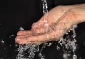 Woda na czarnym tle. Szkło przepełnione wodą. Woda jest wylewana ze szkła. Czysta woda