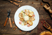 Zdjęcie "Sałatka z krewetek z zielonym serem i pomidorami" może być wykorzystywane do celów osobistych i komercyjnych zgodnie z warunkami zakupionej licencji Royalty-free. Obraz jest dostępny do pobrania w jakości wysokiej rozdzielczości do 5760x3840.