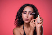 Portret charakteryzatora. Kurs makijażu. Koncepcja samoekspresji klas mistrzowskich. Kobieta trzyma pędzle do makijażu w ustach