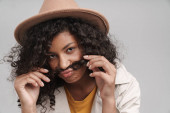 Młoda kobieta robi miny, robi sobie wąsy z długich włosów. Piękna kobieta przygotowuje się do przyjęcia z łatami pod oczami i złotymi rękawiczkami. Kontekst studia.