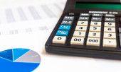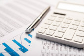 złote długopisy i wykresy biznesowe wykresy w niebieskich kolorach. Koncepcja analizy biznesowej, koncepcja rachunkowości ubezpieczeń finansowych