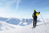 Olbrzymi alpejski narciarz slalomowy na trasie zjazdowej w pięknym alpejskim krajobrazie. Błękitne niebo na tle. Wolne miejsce na tekst