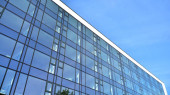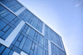 Niebieska ściana zasłony wykonana ze stonowanego szkła i konstrukcji stalowych pod błękitnym niebem. Fragment budynku..