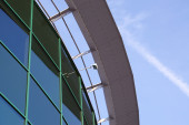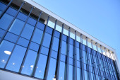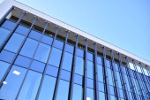 Niebieska ściana zasłony wykonana ze stonowanego szkła i konstrukcji stalowych pod błękitnym niebem. Fragment budynku..