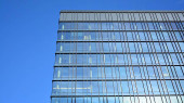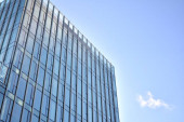 Niebieska ściana zasłony wykonana ze stonowanego szkła i konstrukcji stalowych pod błękitnym niebem. Fragment budynku..