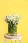 Bukiet świeżych kwiatów rumianku w wazonie na stole na szarym tle