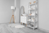 Zdjęcie "Nowoczesna komoda z wyposażeniem kąpielowym w pobliżu bieli w pokoju" może być wykorzystywane do celów osobistych i komercyjnych zgodnie z warunkami zakupionej licencji Royalty-free. Obraz jest dostępny do pobrania w jakości wysokiej rozdzielczości do 5760x3840.
