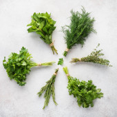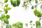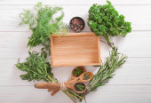 Dłonie z misą świeżej pietruszki i przypraw na białym tle