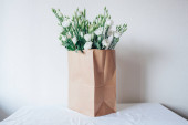 Zdjęcie "Kobieta trzyma torbę na zakupy z kwiatami. Koncepcja usługi dostawy makieta z miejsca do kopiowania. Blisko samica posiada w ręcznym papierze puste opakowanie z tulipanami izolowane na tle" może być wykorzystywane do celów osobistych i komercyjnych zgodnie z warunkami zakupionej licencji Royalty-free. Obraz jest dostępny do pobrania w jakości wysokiej rozdzielczości do 5760x3840.