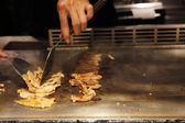 Japoński kucharz gotowania mięsa i warzyw w restauracji teppanyaki