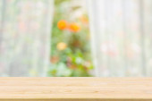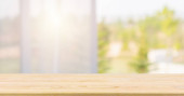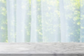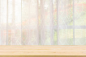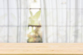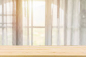 Pusty blat drewniany z zasłoną okienną abstrakcyjne rozmycie tła do wyświetlania produktu