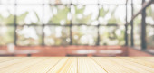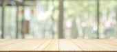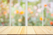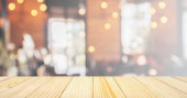 Pusty drewniany blat stołowy z kawiarnią restauracja kawiarnia okno wnętrze abstrakcyjne rozmycie rozmyte z bokeh tle światła do montażu produktu wyświetlacz