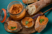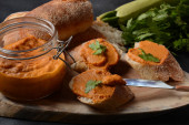 Puree z dyni (kawior squasha) w szklanym słoiku i na plasterkach chleba.Domowej roboty kawior z warzyw