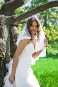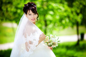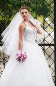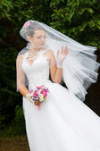 piękne panny młodej w sukni ślubnej z bukietem kwiatów na charakter