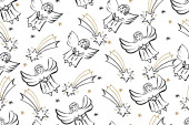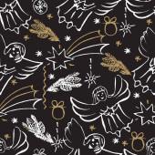 Wektor Christmas stylowe tło w odcieniach złota. Płynny wzór ze złotymi i białymi elementami, płatki śniegu, świąteczne dekoracje, gwiazdy i anioły na wzór powierzchni, scrapbooking, opakowanie prezentów