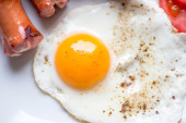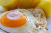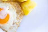 Jajko smażone z ziemniakami na białym talerzu