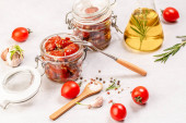 Domowej roboty suszone pomidory, oliwa z oliwek w szklanej butelce, świeży rozmaryn i przyprawy na jasnym tle. Odcisk do kuchni. ukierunkowanie selektywne.