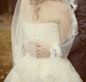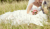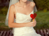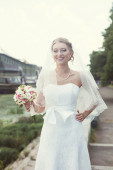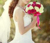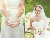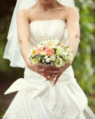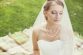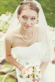 panna młoda z bukiet siedzi w parku