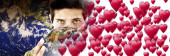 nagłówek strony uczennicy w okularach trzymając papier wycięty globus stojąc odizolowany na białym