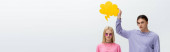 Panoramiczne ujęcie zaszokowanej dziewczyny z plecakiem z książkami i jabłkiem na białym tle