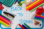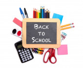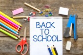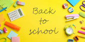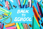 Tekst Powrót do szkoły i różne materiały piśmienne na zielonej tablicy, płaski leżak
