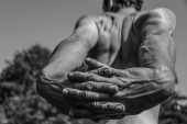 Mężczyzna ręce zbliżenie Czarno-biały obraz muskularny mężczyzna, atletyczny ciało, piękny męski forma mięsień, ulga. Piękne silne i elastyczne ciało, sexy atrakcyjne.