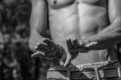 Mężczyzna ręce zbliżenie Czarno-biały obraz muskularny mężczyzna, atletyczny ciało, piękny męski forma mięsień, ulga. Piękne silne i elastyczne ciało, sexy atrakcyjne.