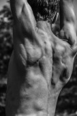 Męski tułów, brzuch klatki piersiowej ramiona zbliżenie Czarno-biały obraz muskularnego mężczyzny, wysportowane ciało, piękna męska forma mięśni, ulga. Piękne silne i elastyczne ciało, sexy atrakcyjne.