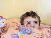 chore dziecko w łóżku z misiem