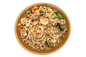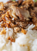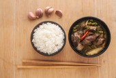 Biały ryż z grillowaną wieprzowiną w czarnej misce na białym tle, Ryż z Azji, Ryż w azjatyckim stylu