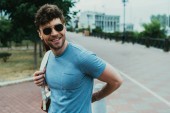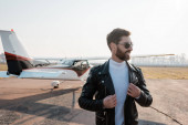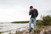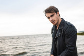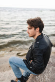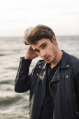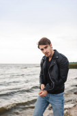 Młody mężczyzna w skórzanej kurtce spoglądający w tle w lesie