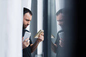 Panoramiczne ujęcie mężczyzny w skórzanej kurtce spoglądającego na brzeg morza