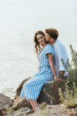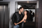 Mężczyzna w skórzanej kurtce całuje dziewczynę z morzem w tle