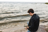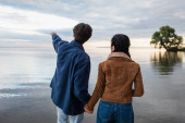 Widok z tyłu pary w czarnych skórzanych kurtkach patrzących na morze