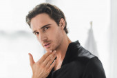 Młody mężczyzna w skórzanej kurtce patrzący w kamerę na morzu