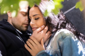 Panoramiczne ujęcie młodej kobiety obejmującej chłopaka w skórzanej kurtce nad morzem