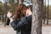 Mężczyzna całuje i dotyka włosów kobiety w skórzanej kurtce na plaży