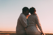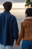 Widok z tyłu pary w skórzanych kurtkach stojących na plaży o zachodzie słońca