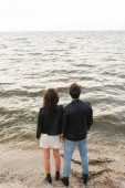Selektywne skupienie młodych par w skórzanych kurtkach rzucających piaskiem na plażę