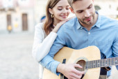 Burnette kobieta dotykając włosów i patrząc na chłopaka gra na gitarze akustycznej na plaży w godzinach wieczornych