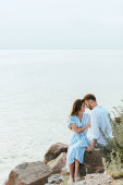 Zdjęcie "Młoda para przytula się do kamieni i morza na plaży " może być wykorzystywane do celów osobistych i komercyjnych zgodnie z warunkami zakupionej licencji Royalty-free. Obraz jest dostępny do pobrania w jakości wysokiej rozdzielczości do 5760x3840.