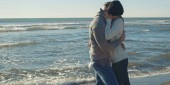 Poziomy obraz młodej kobiety przytulającej chłopaka w pobliżu morza o zachodzie słońca