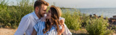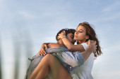 Młoda para trzymająca się za ręce stojąc w wodzie morskiej o zachodzie słońca